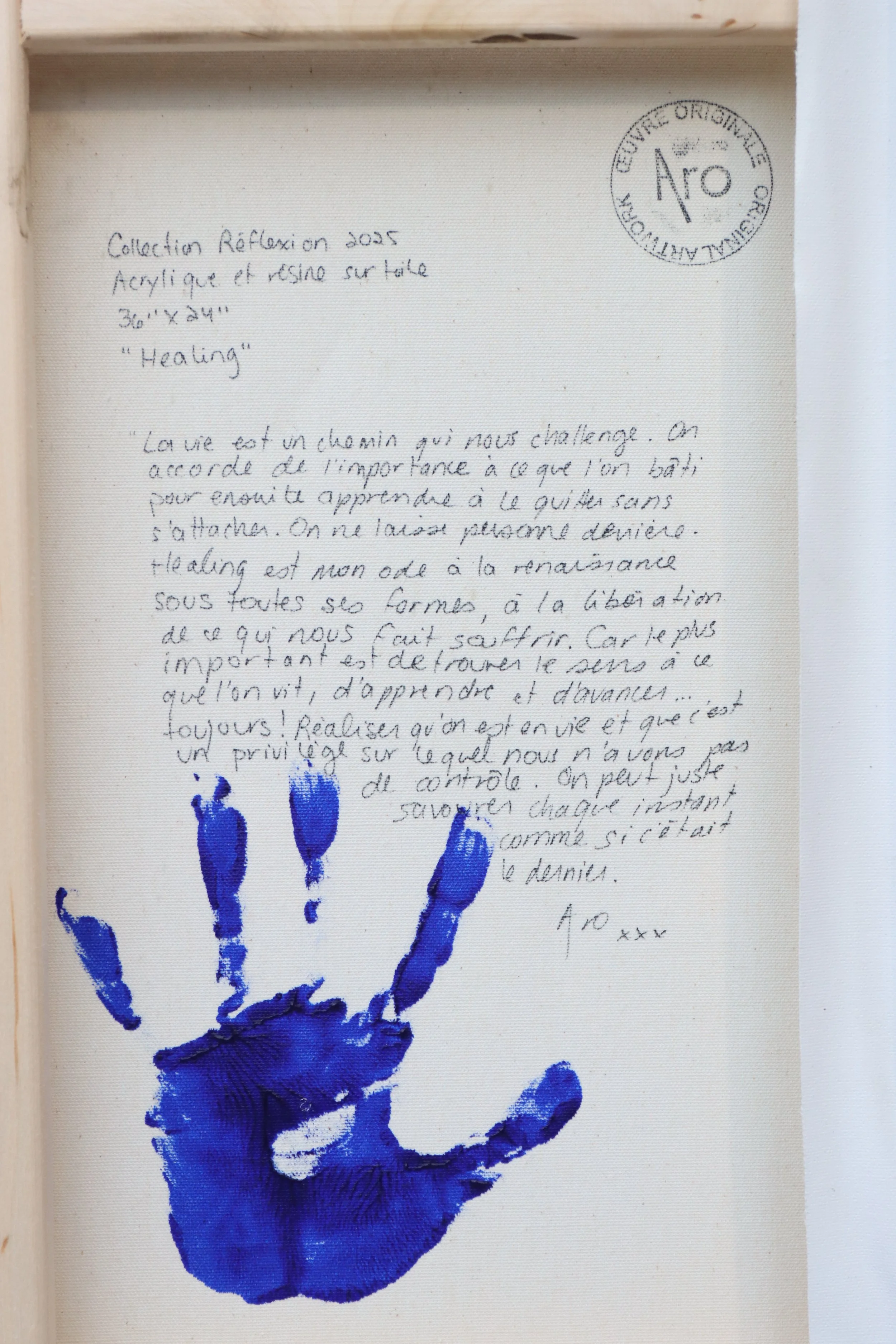 Inscription Verso: ”La vie est un chemin qui nous challenge. On accorde de l'importance à ce que l'on bâtit pour ensuite apprendre à le quitter sans s'attacher. On ne laisse personne derrière. Healing est mon ode à la renaissance sous toutes ses formes, à la libération de ce qui nous fait souffrir. Car le plus important est de trouver le sens à ce que l'on vit, d'apprendre et d'avancer... toujours ! Réaliser qu'on est en vie et que c'est un privilège sur lequel nous n'avons pas de contrôle. On peut juste savourer chaque instant comme si c'était le dernier.” -Aro
