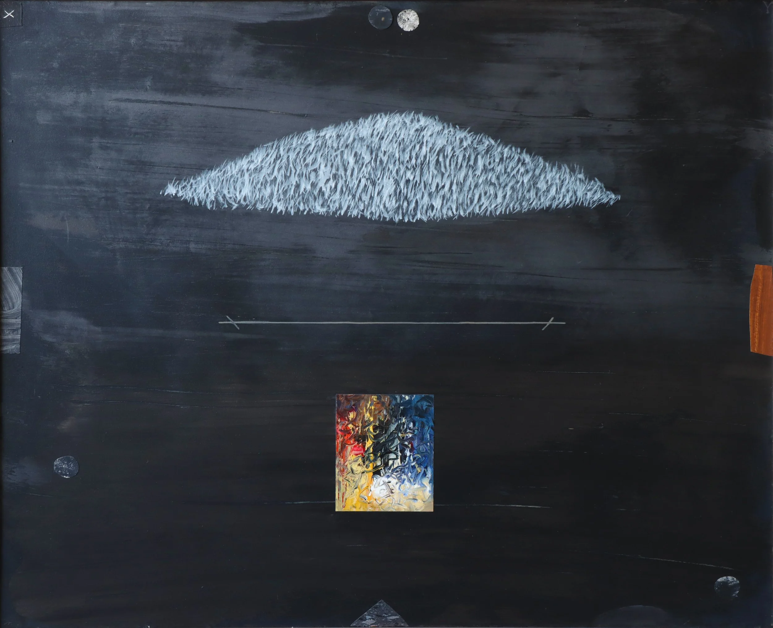 Small collaged elements are placed along the edges of the composition, creating tactile boundaries while reinforcing the painting’s contemplative framework. Together, the symbolic coordinates and layered materials deepen the series’ exploration of balance, memory, and spiritual transcendence, marking this work as a significant step in the evolution of the Spirit Arise imagery.