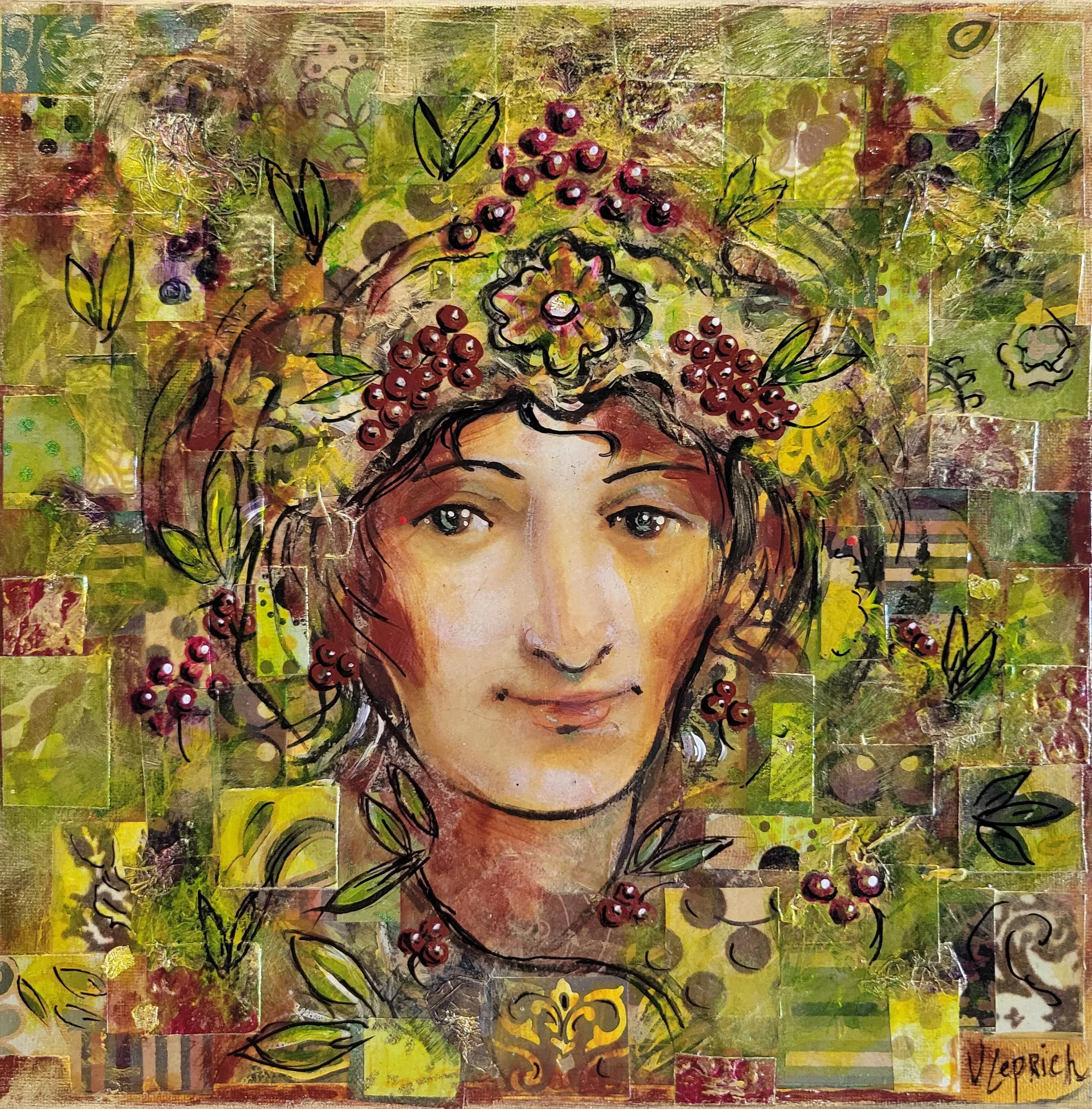Working primarily on canvas, Leprich layers texture and symbolism to explore themes of transformation, femininity, ancestry, and the sacred. Her process is intuitive and narrative-driven, offering collectors an experience that transcends the visual to become reflective and meaningful. In one of her signature pieces, a central figure crowned with grapes and leaves becomes a living metaphor for abundance, fertility, and inner strength.